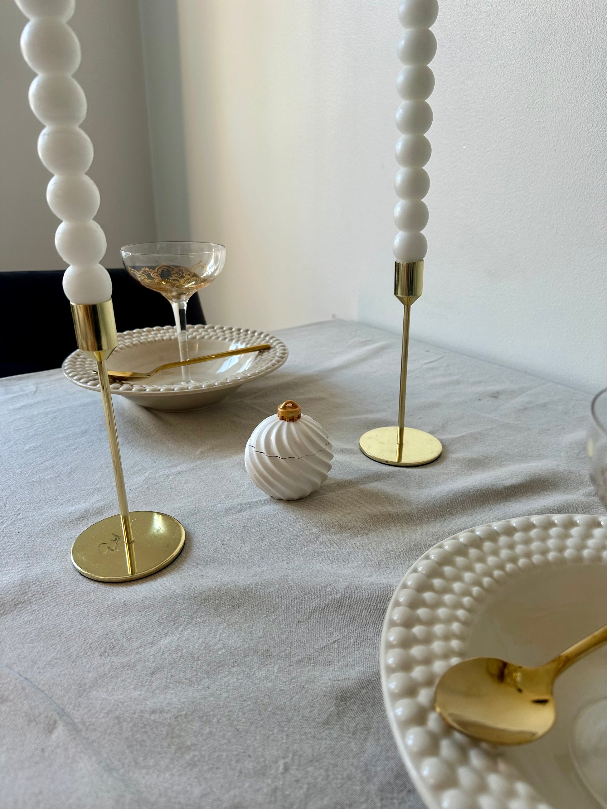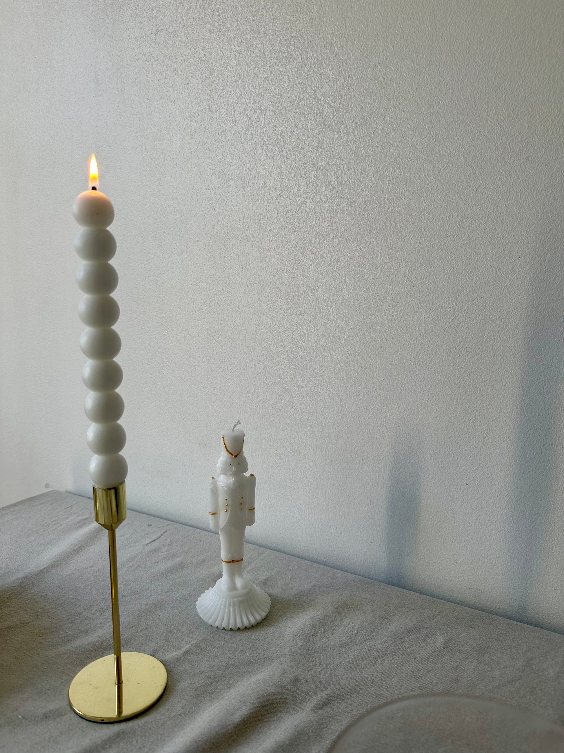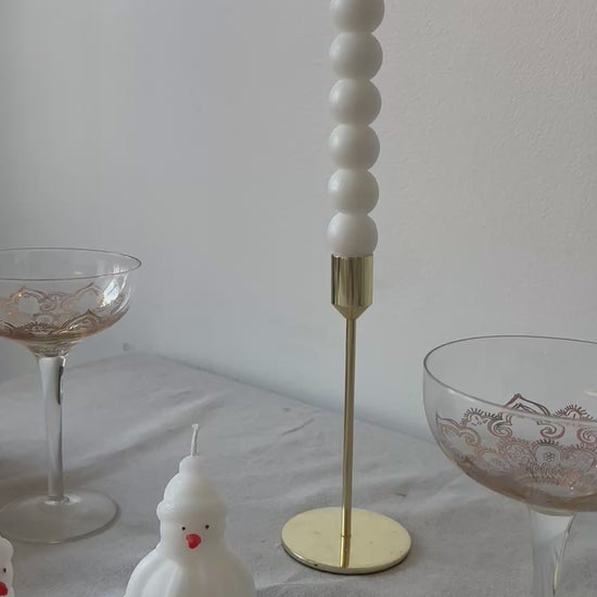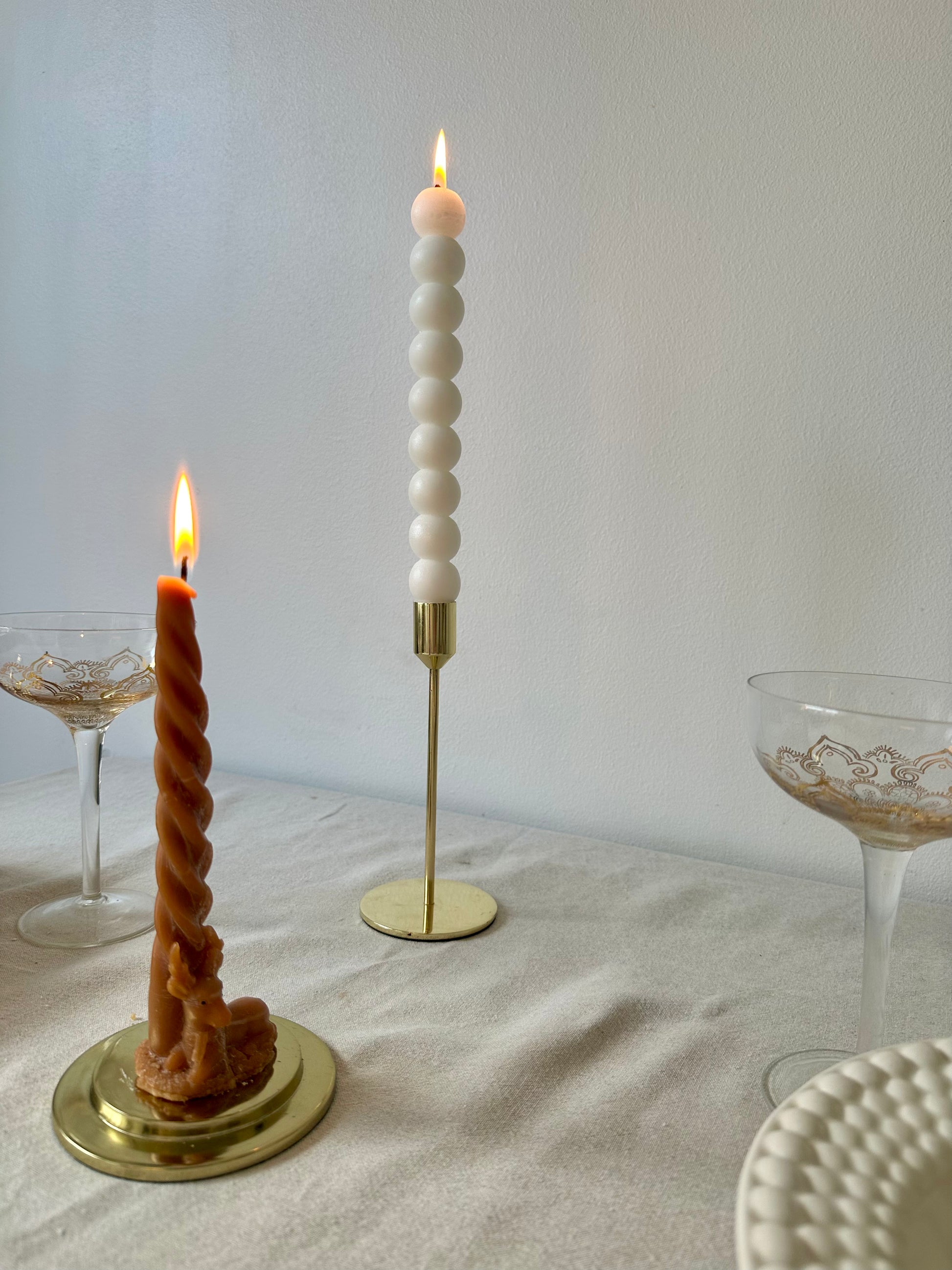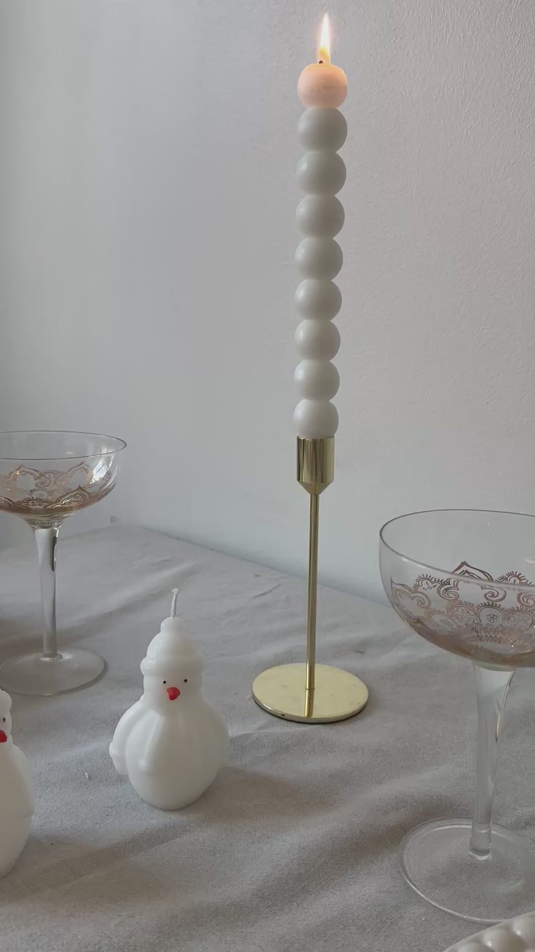 Handgjorda bubbelformade långa stearin ljus med pärlemor finish. Ca 25cm höga och 2,2cm breda i basen. Säljes i par om 2st.
