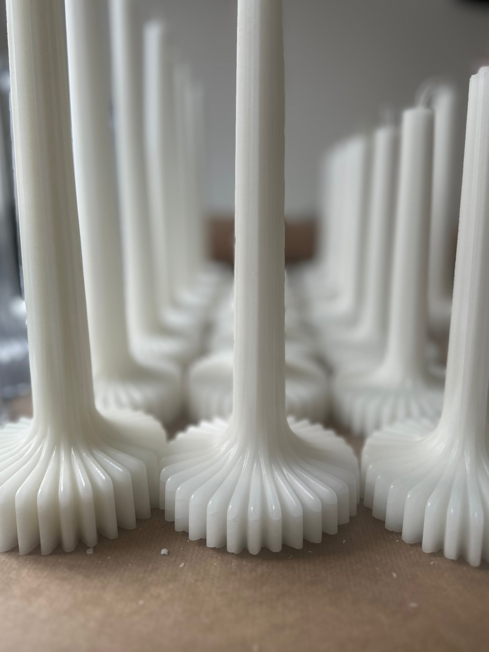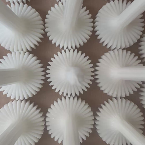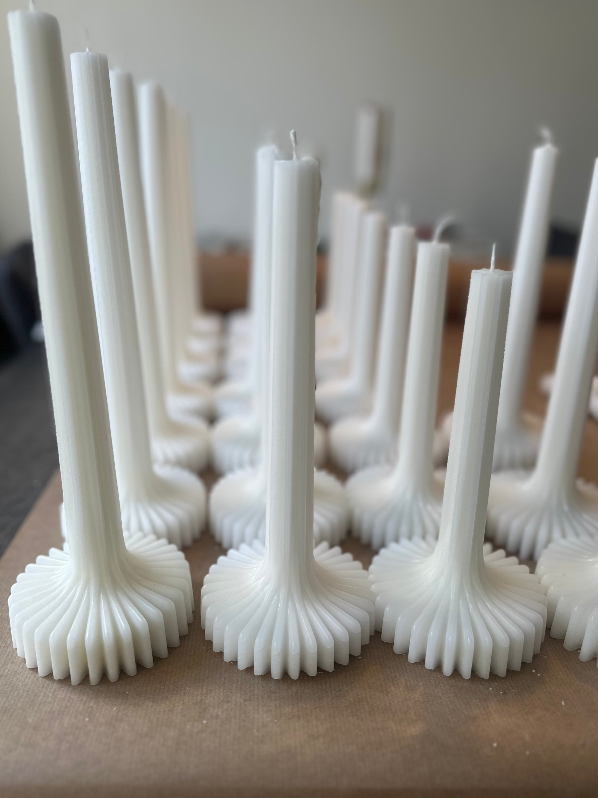 2 st stearinljus med ståtlig modern hållning. Ca 10cm i basen och 25cm (stl M) respektive 22cm (stl S) i höjd. Ljuset är modernt och basen inspireras av kugghjul som tillsammans tar oss framåt. Perfekta som en gåva till den trendsäkra värden eller som ståtligt gör er minimalistiska dukning. Perfekta clean girl ljuset om du frågar Tell & Glow. Kommer i vitt i 100% stearin från Sverige och kräm vit/beige med stearin och lite rent bivax. Säljes 2st en stl S och en stl M. Se även vår största modell i stl L. Dessa går även att köpa med mängdrabatt till ett event, skriv på kontakta oss antal så återkommer vi med en offert.