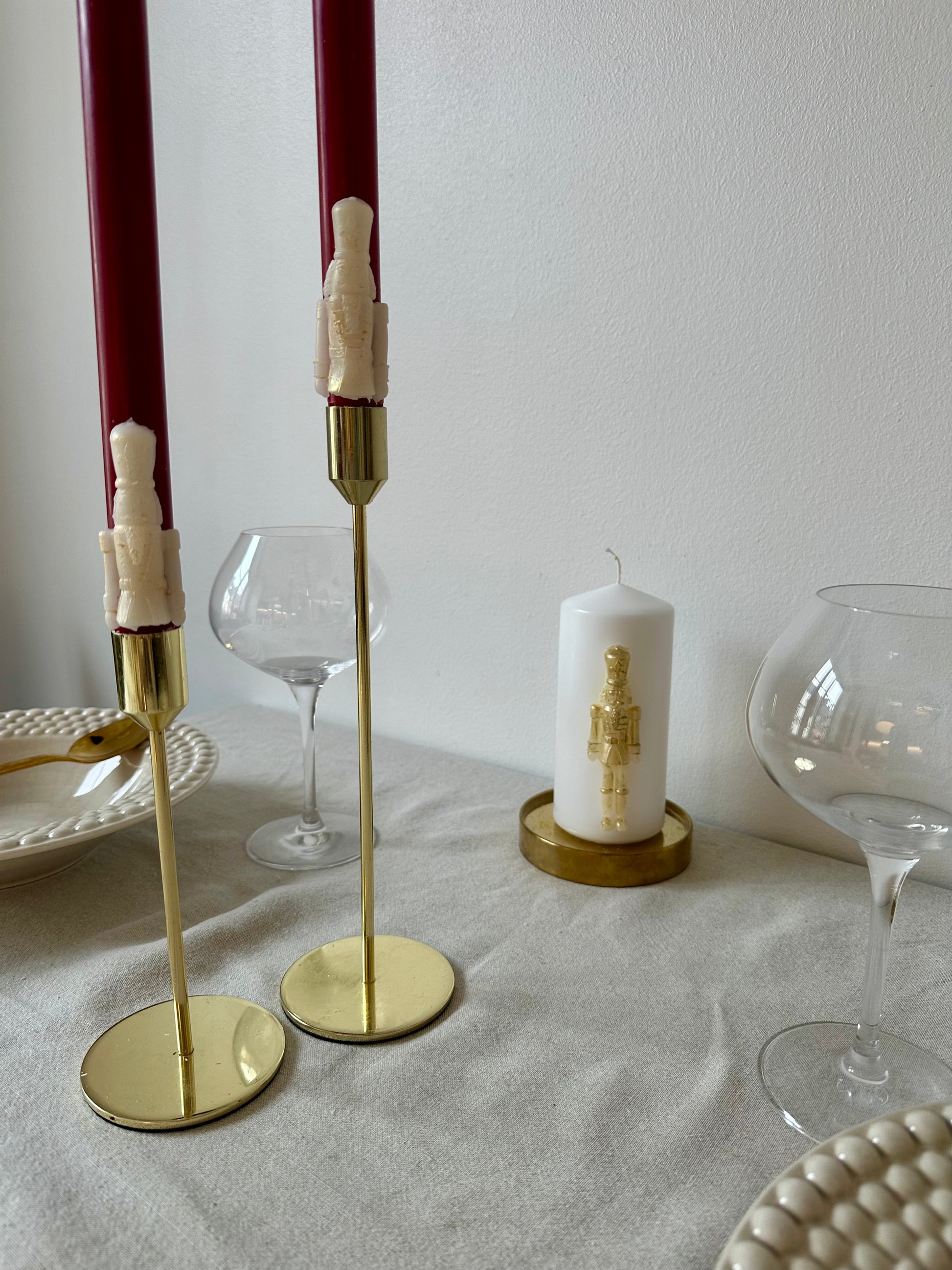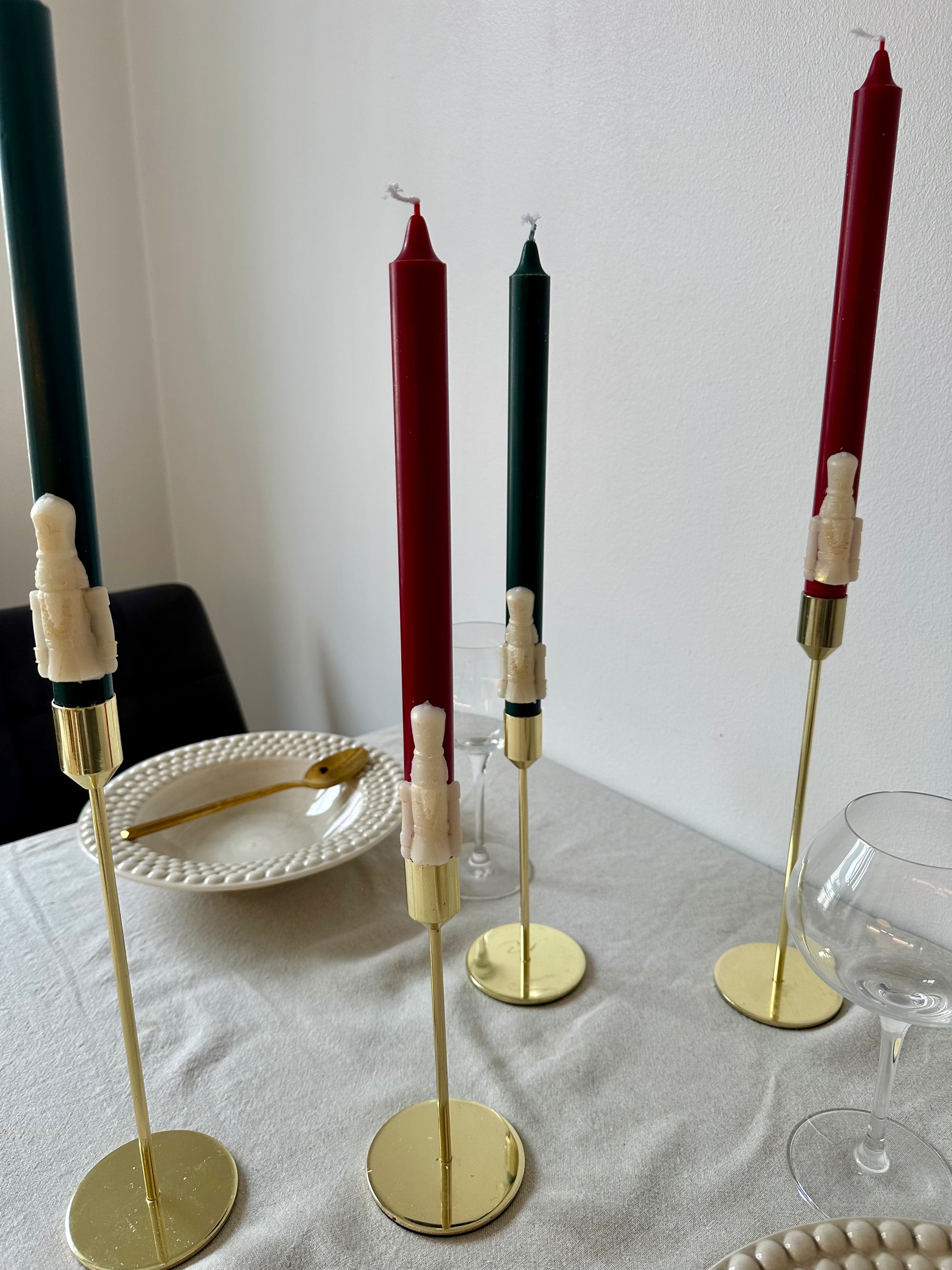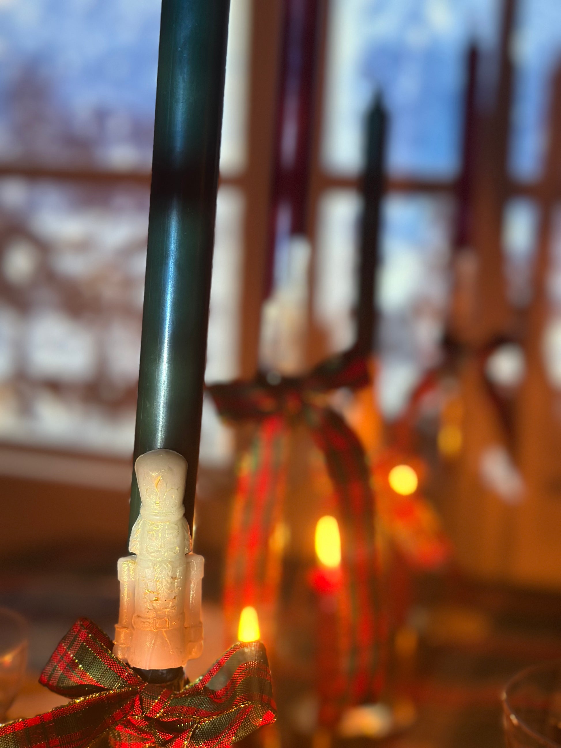 Långa stearin kronljus med nötknäppare och ca 8+h brinntid. Finns i klassiskt rött eller grönt med guldiga nötknäppare. Ca 29cm höga. Säljes i par om 2st.