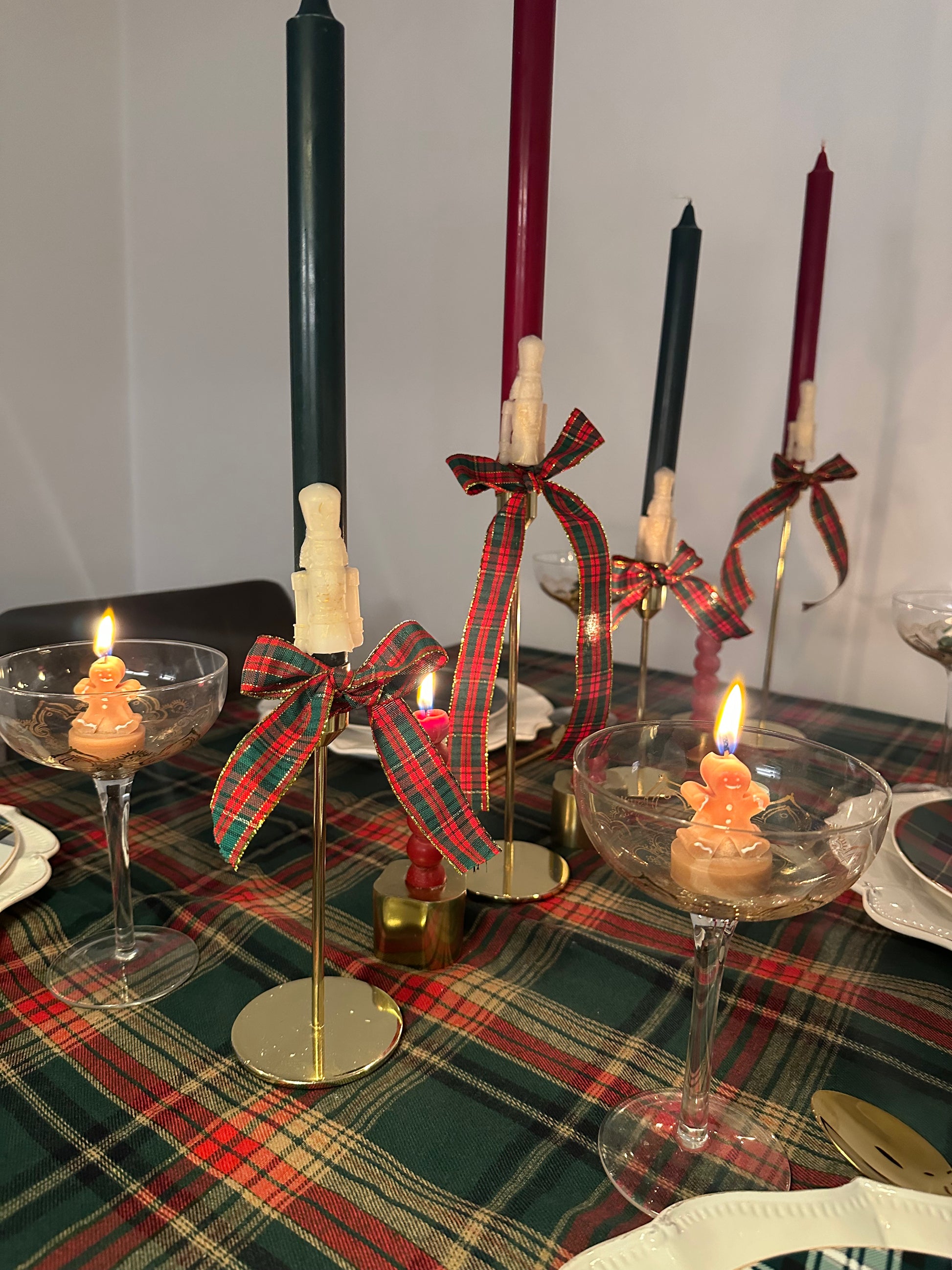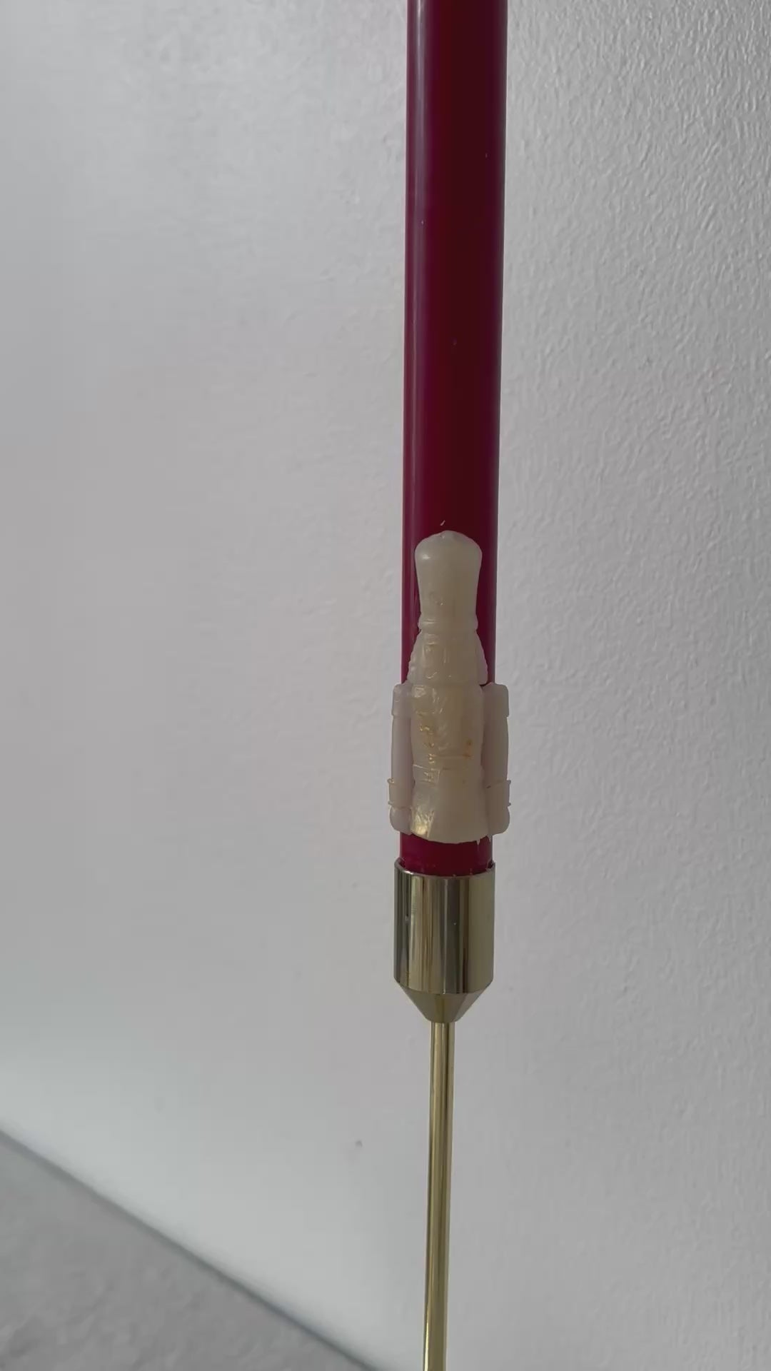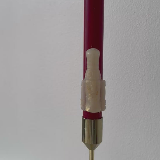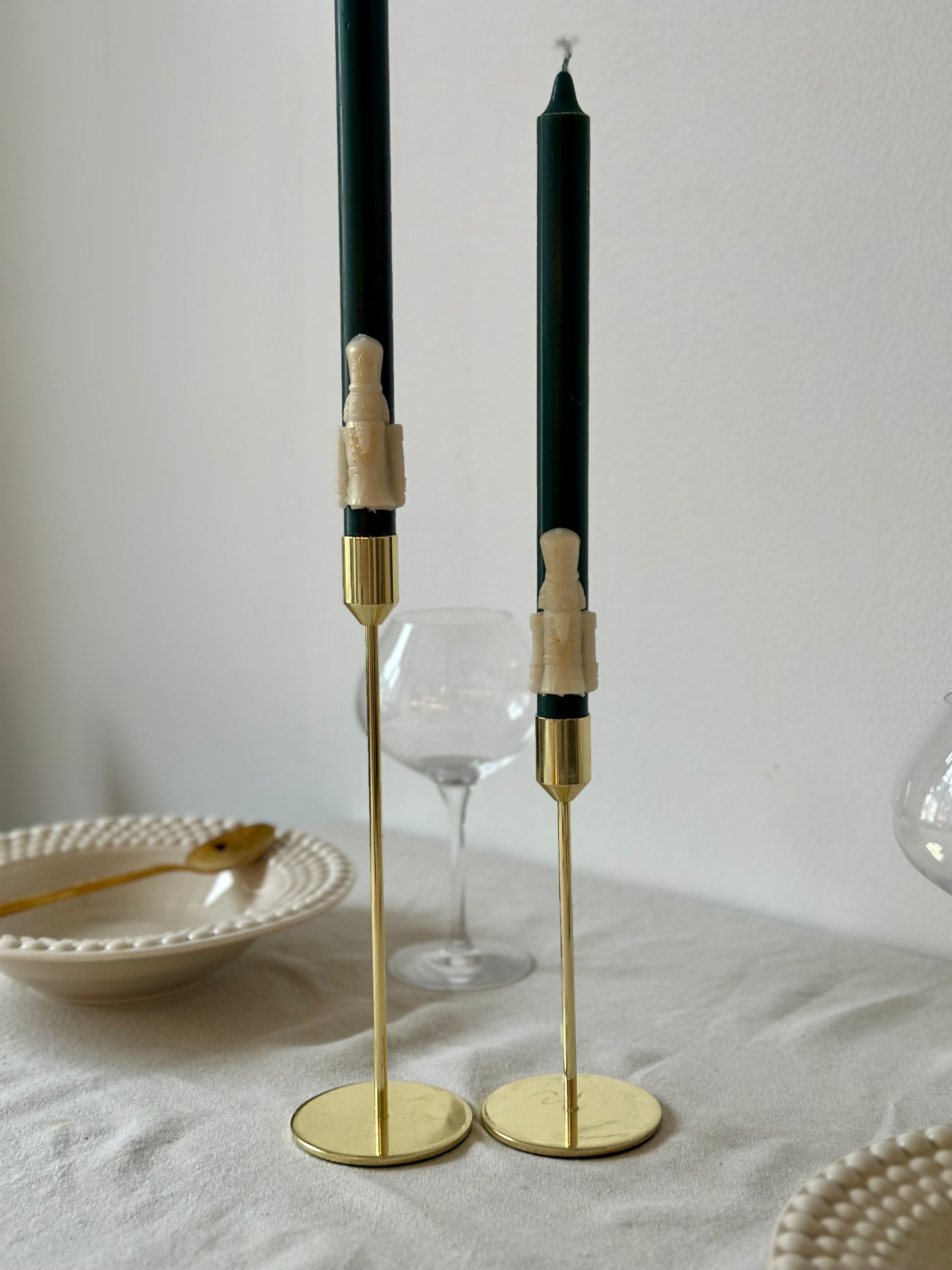 Långa stearin kronljus med nötknäppare och ca 8+h brinntid. Finns i klassiskt rött eller grönt med guldiga nötknäppare. Ca 29cm höga. Säljes i par om 2st.