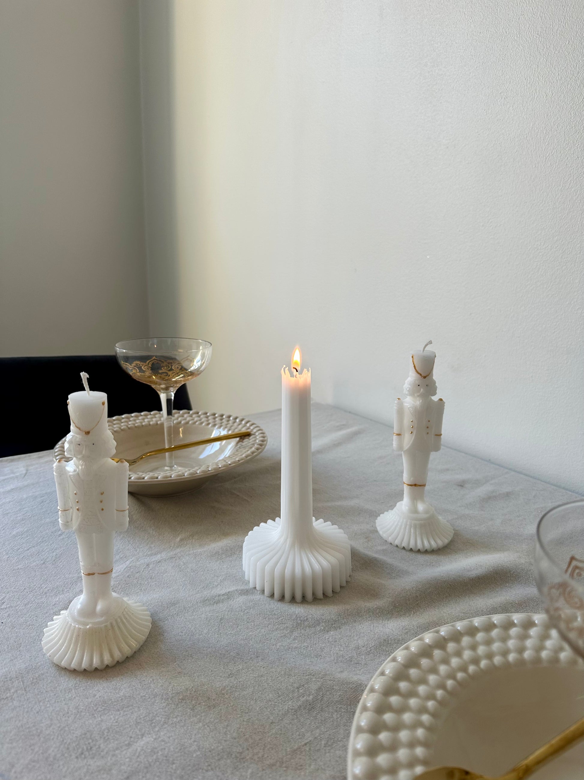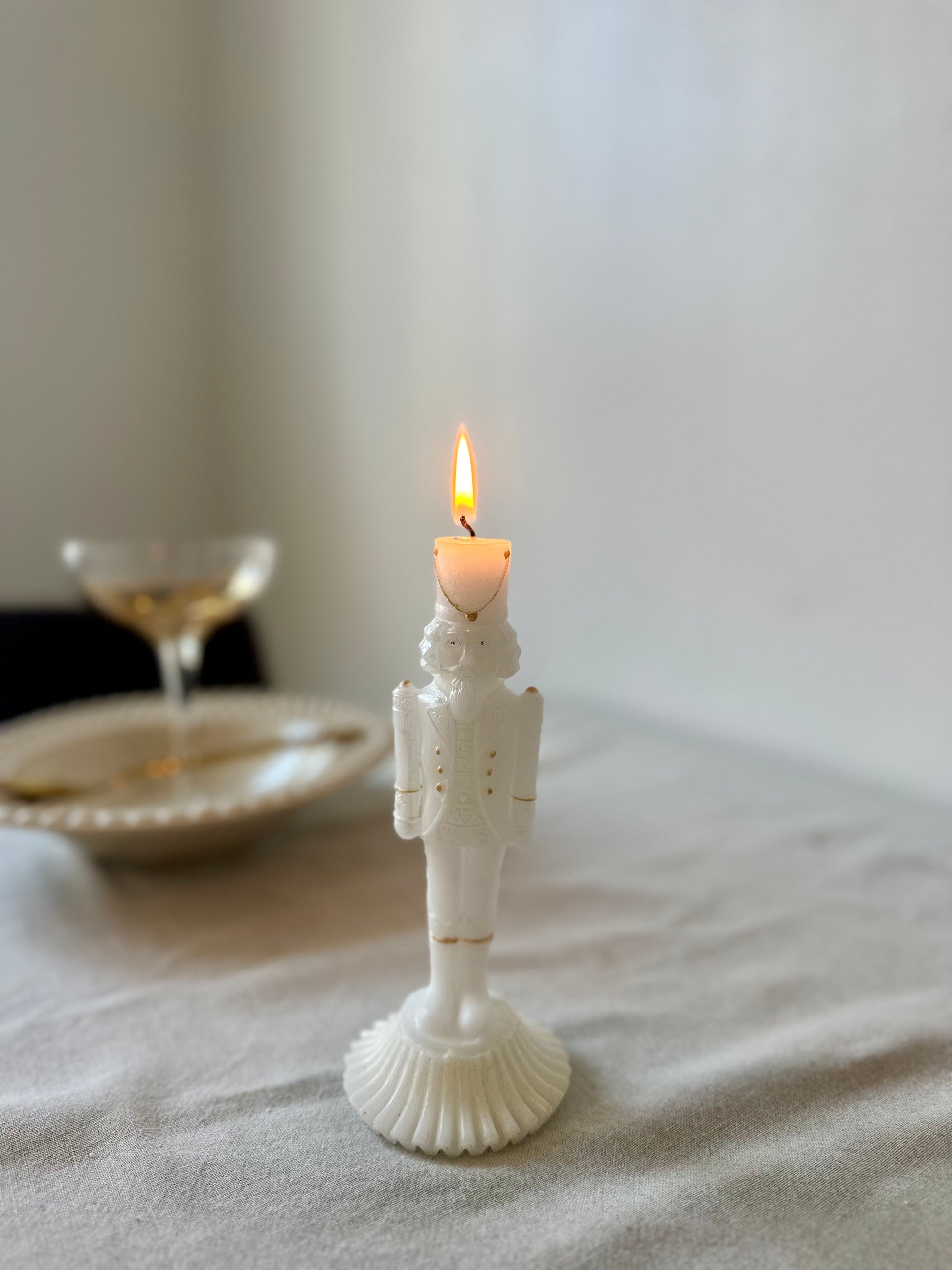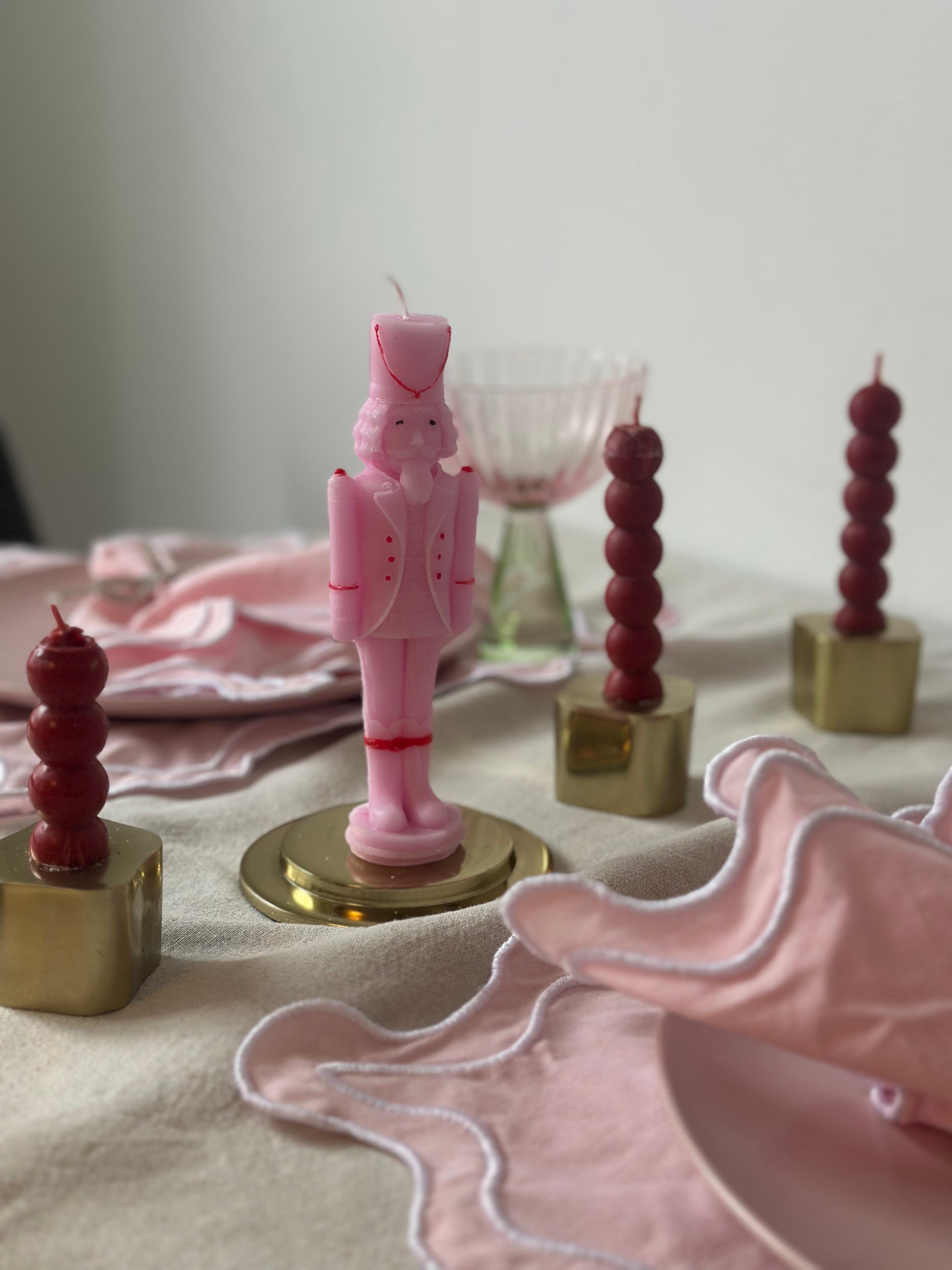 Klassisk nötknäppare handgjord i stearin. Nötknäpparen i rosa står utan piedestal och vill gärna stå stadig på ett underlag gärna med en pigg då han är lite längre ca 18cm hög och 4cm bas i diameter. Nötknäpparen i pärlemor vitt och guld är ca 20 cm hög. Säljes styckesvis. Otroligt vacker med detaljer! Varför inte våga en rosa nötknäppare med röda detaljer i vax?