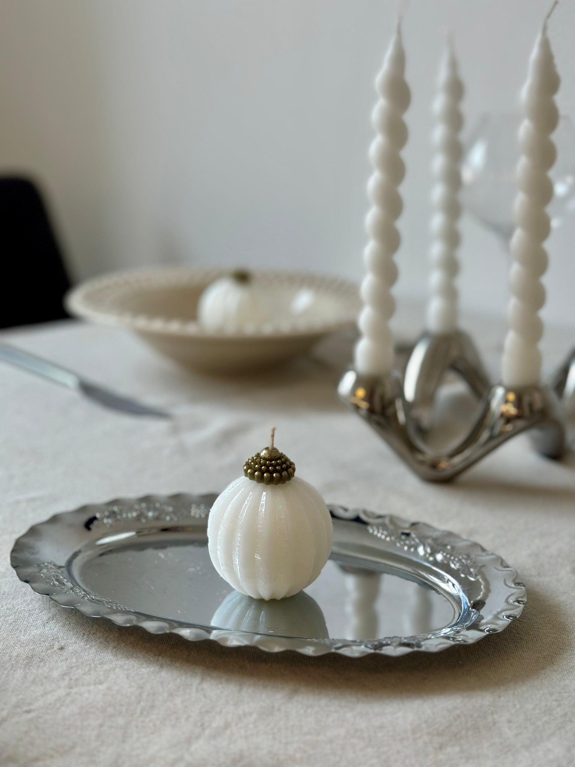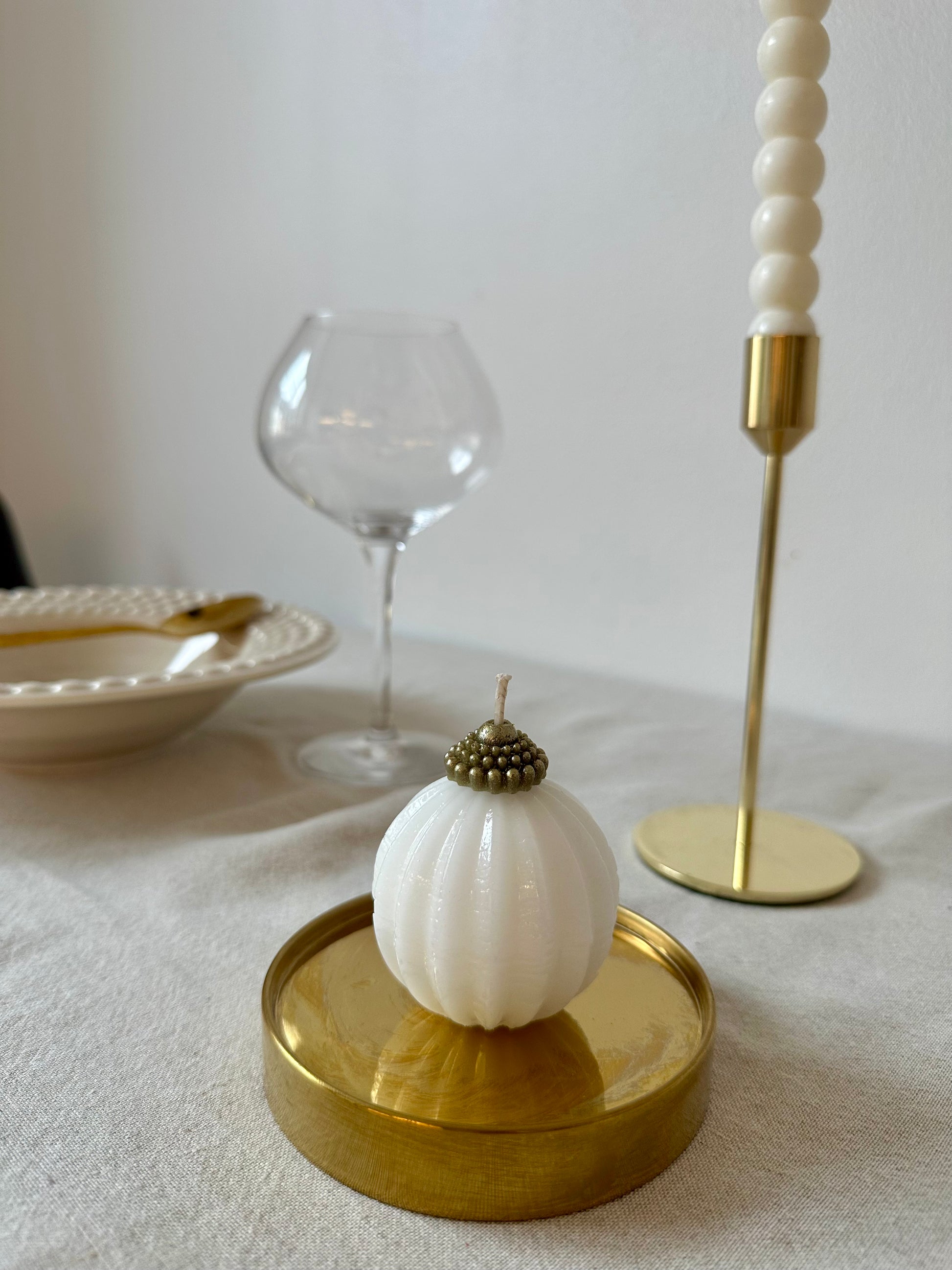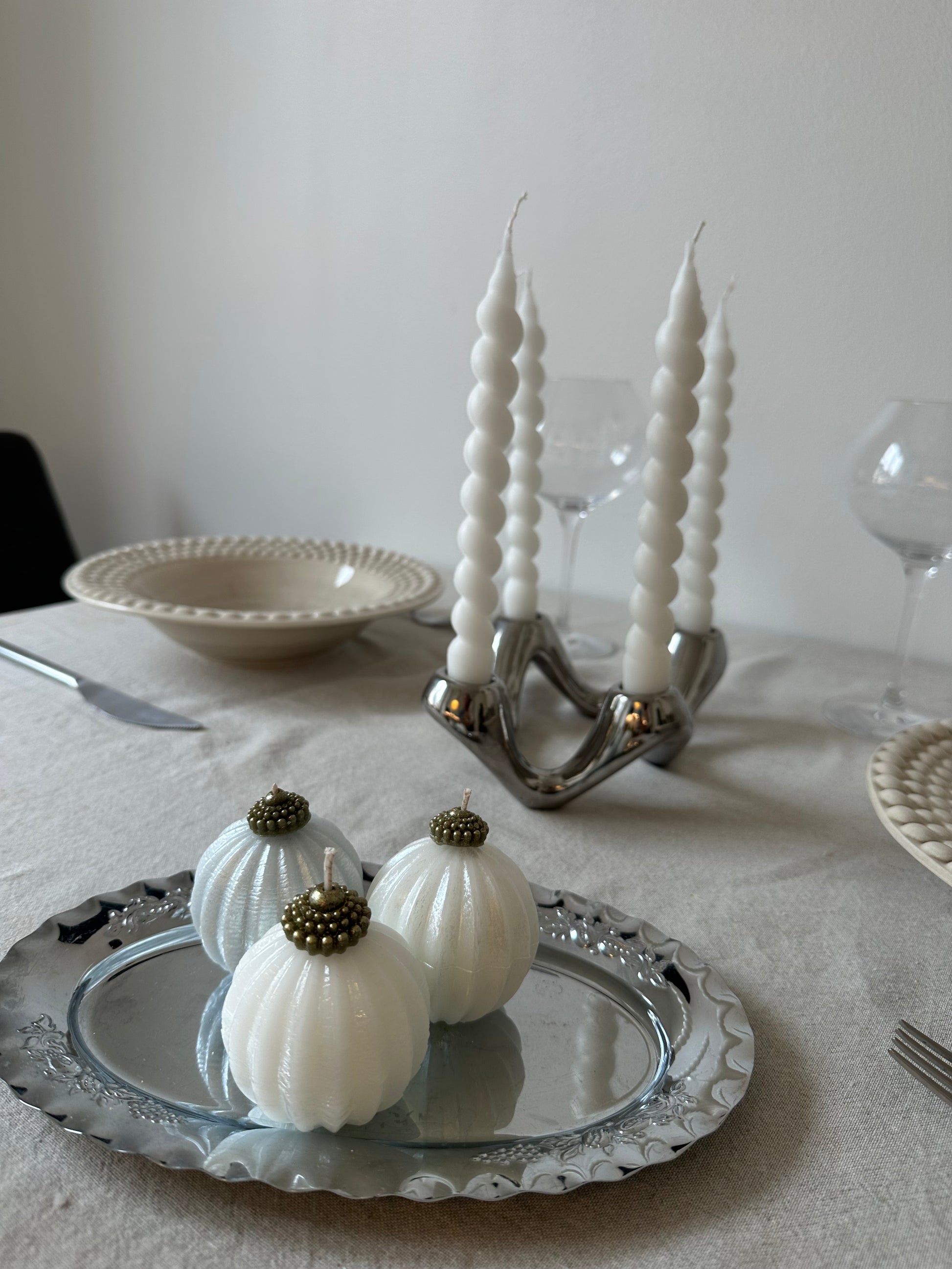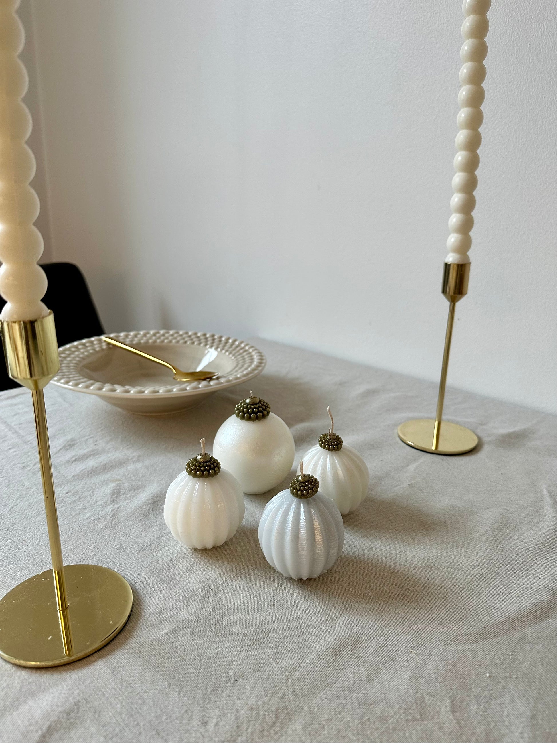 Vad sägs om ett handgjort stearin ljus som ser ut som en julkula? Med dess räfflade utsida och guld bivax topp så blir den en lyxig och unik del av din dukning eller julpynt. Ljuset är ca 7cm och kommer lackad i glansig vit eller ljusblå pärlemor. Säljes styckvis så du kan välja antal kulor! Perfekt som present till en stilren värdinna.