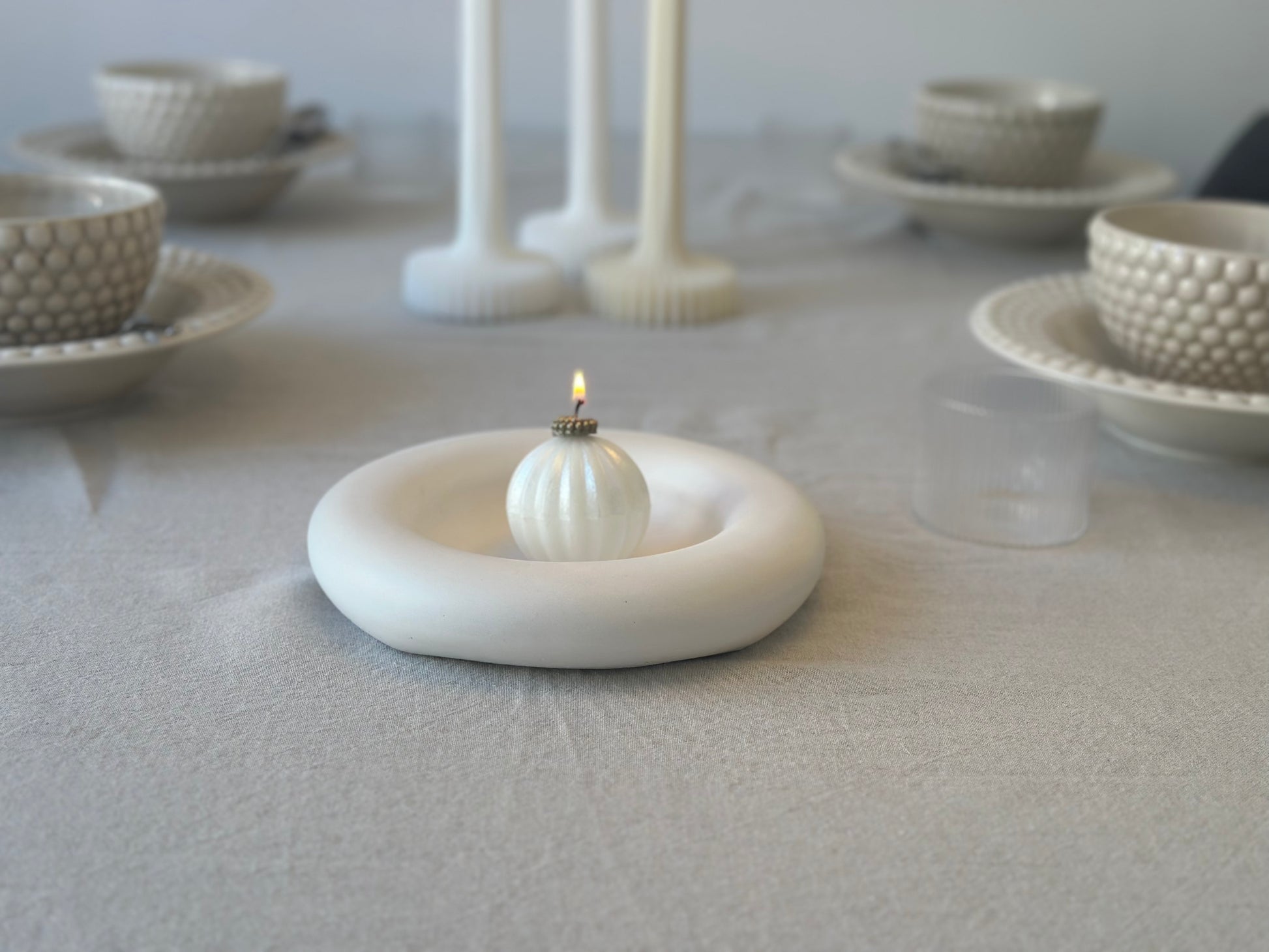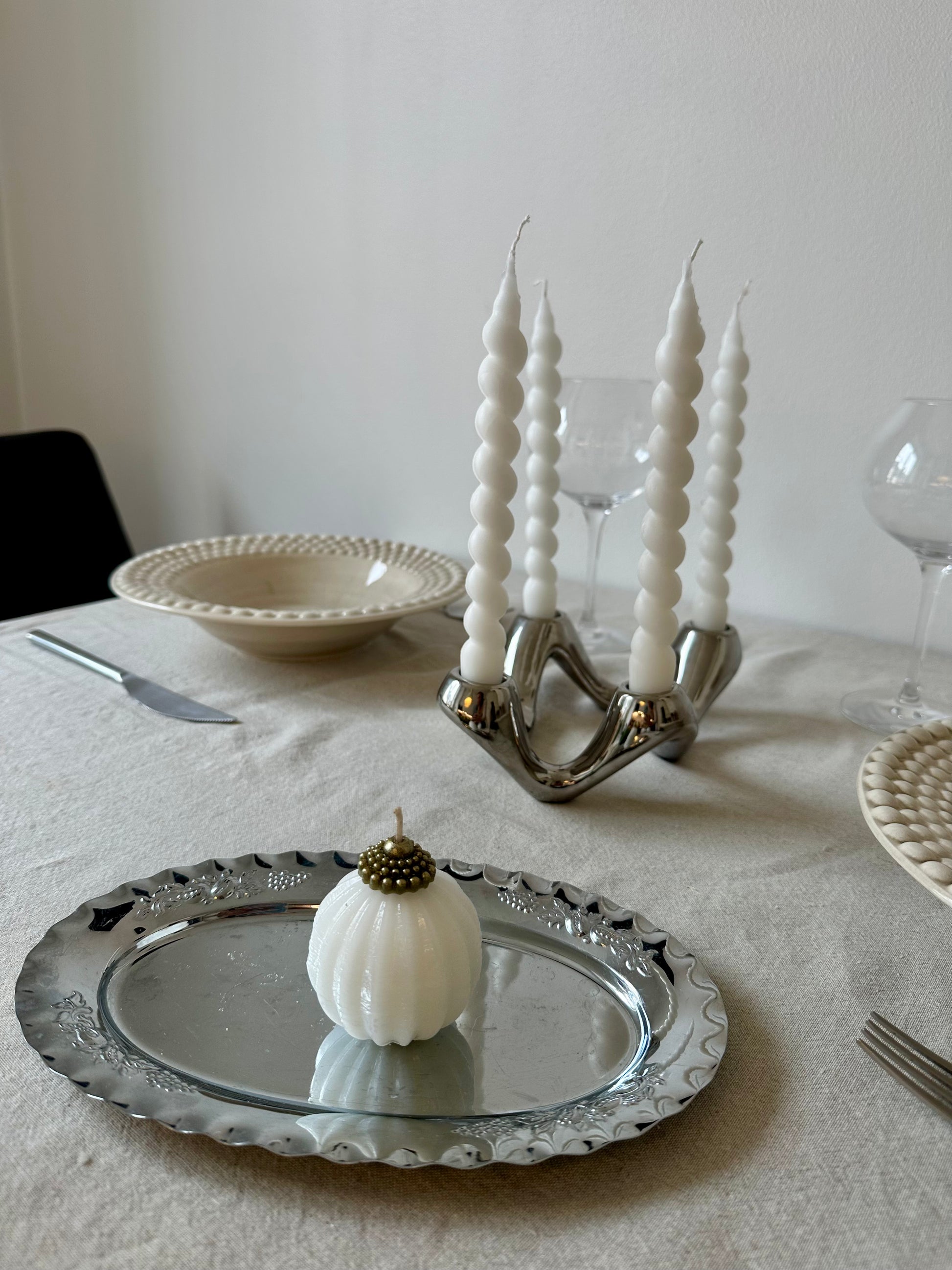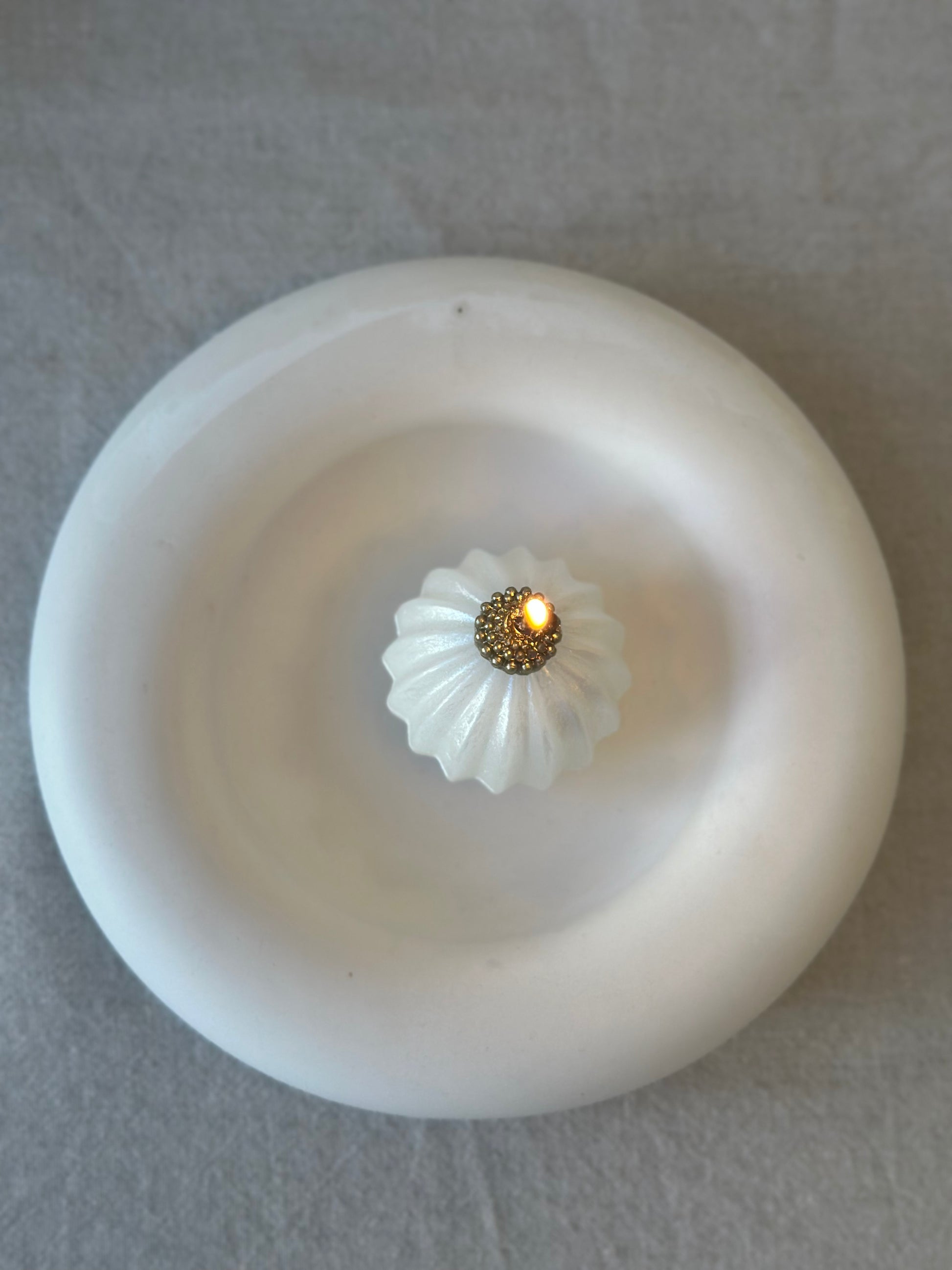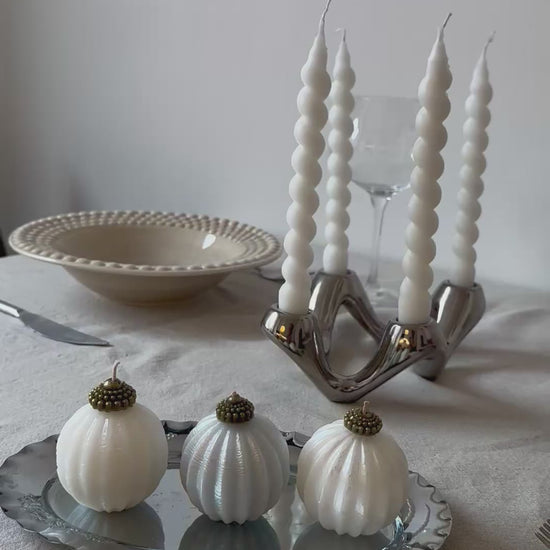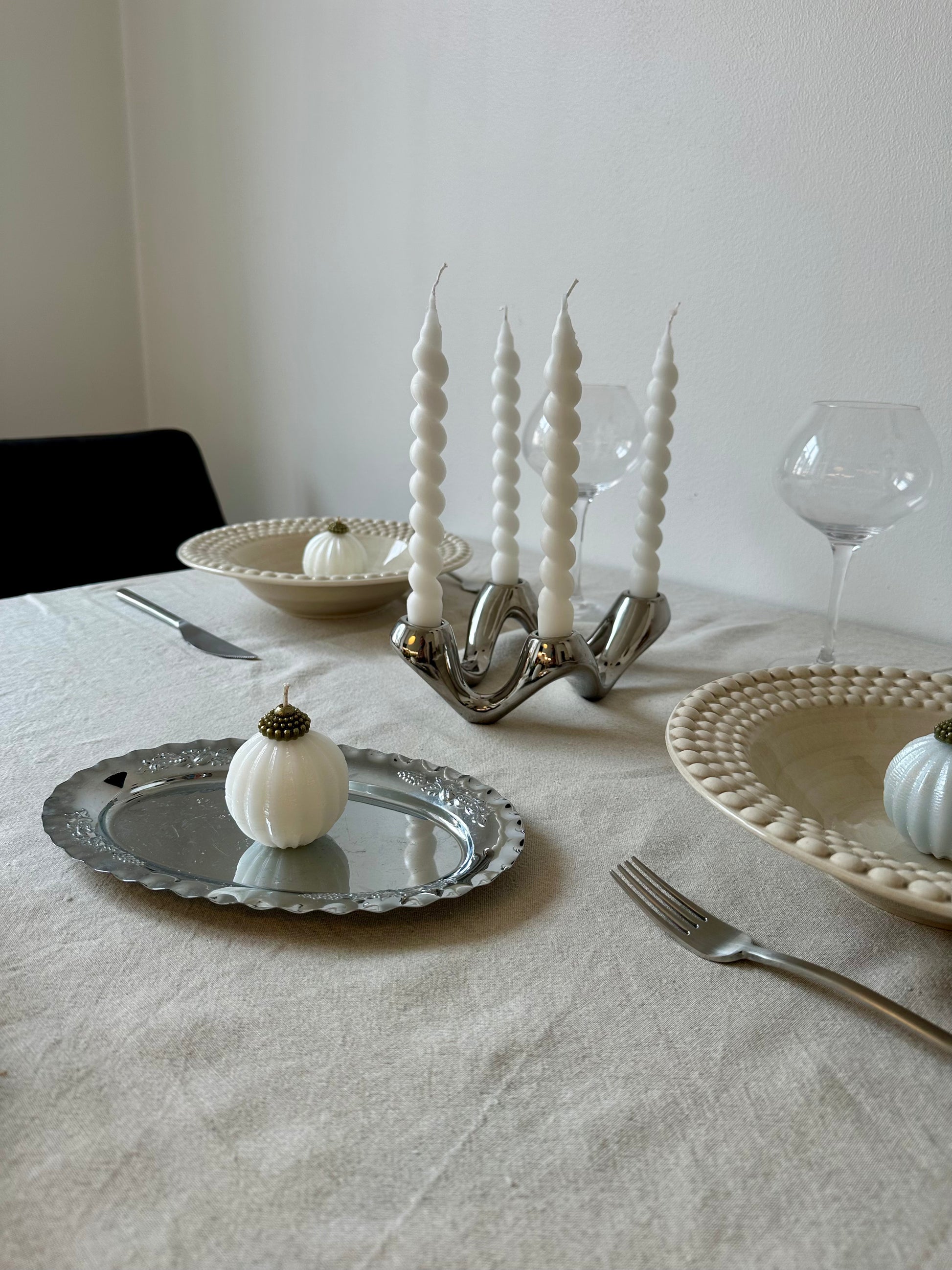 Vad sägs om ett handgjort stearin ljus som ser ut som en julkula? Med dess räfflade utsida och guld bivax topp så blir den en lyxig och unik del av din dukning eller julpynt. Ljuset är ca 7cm och kommer lackad i glansig vit eller ljusblå pärlemor. Säljes styckvis så du kan välja antal kulor! Perfekt som present till en stilren värdinna.