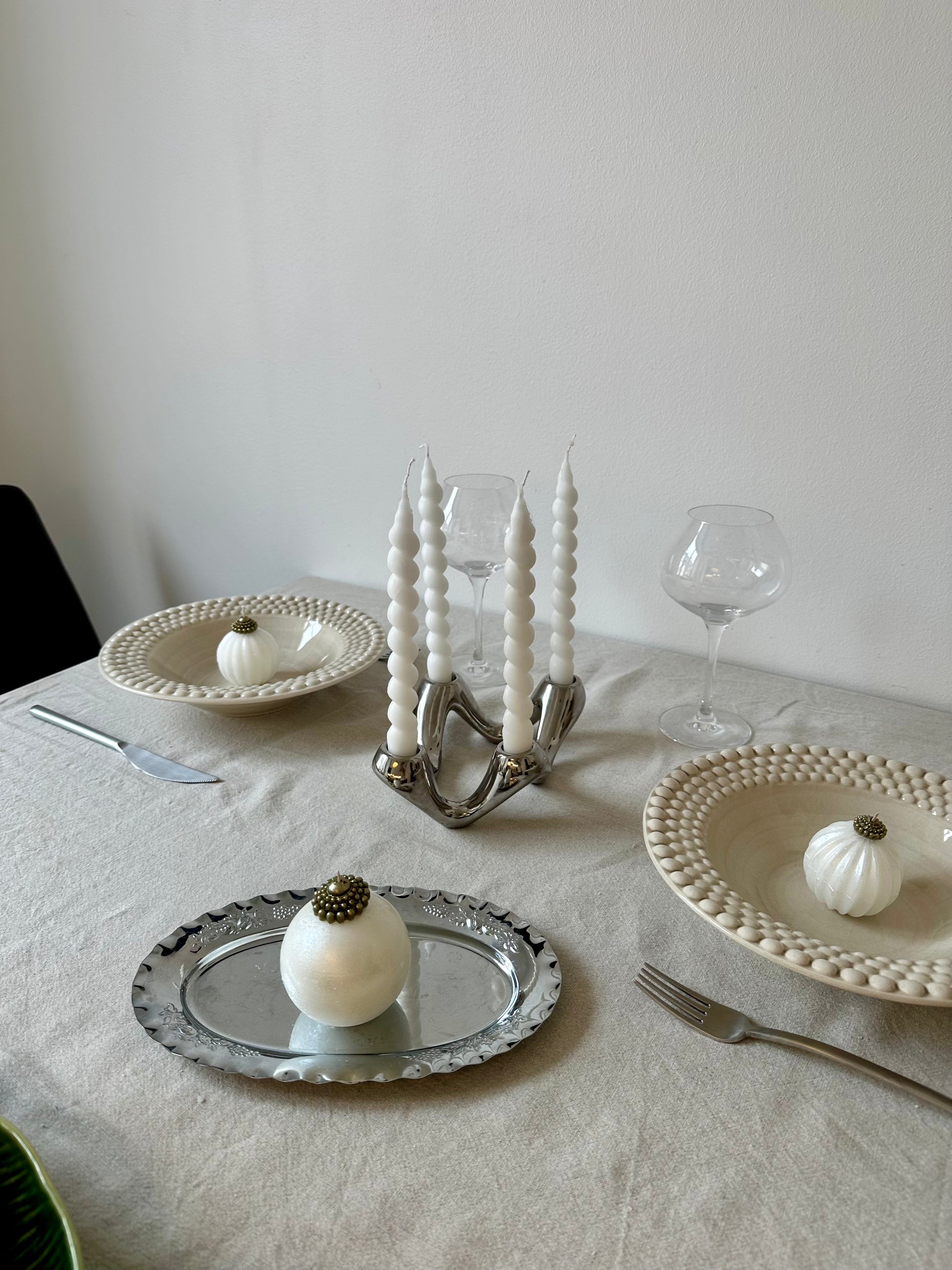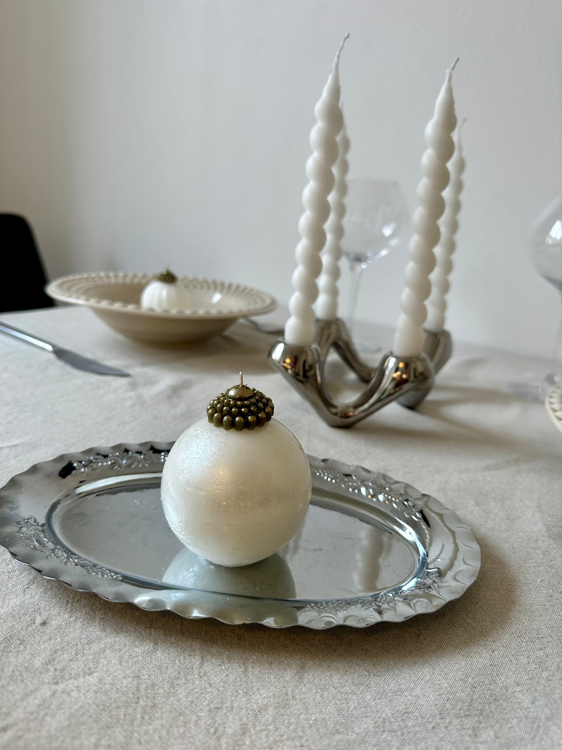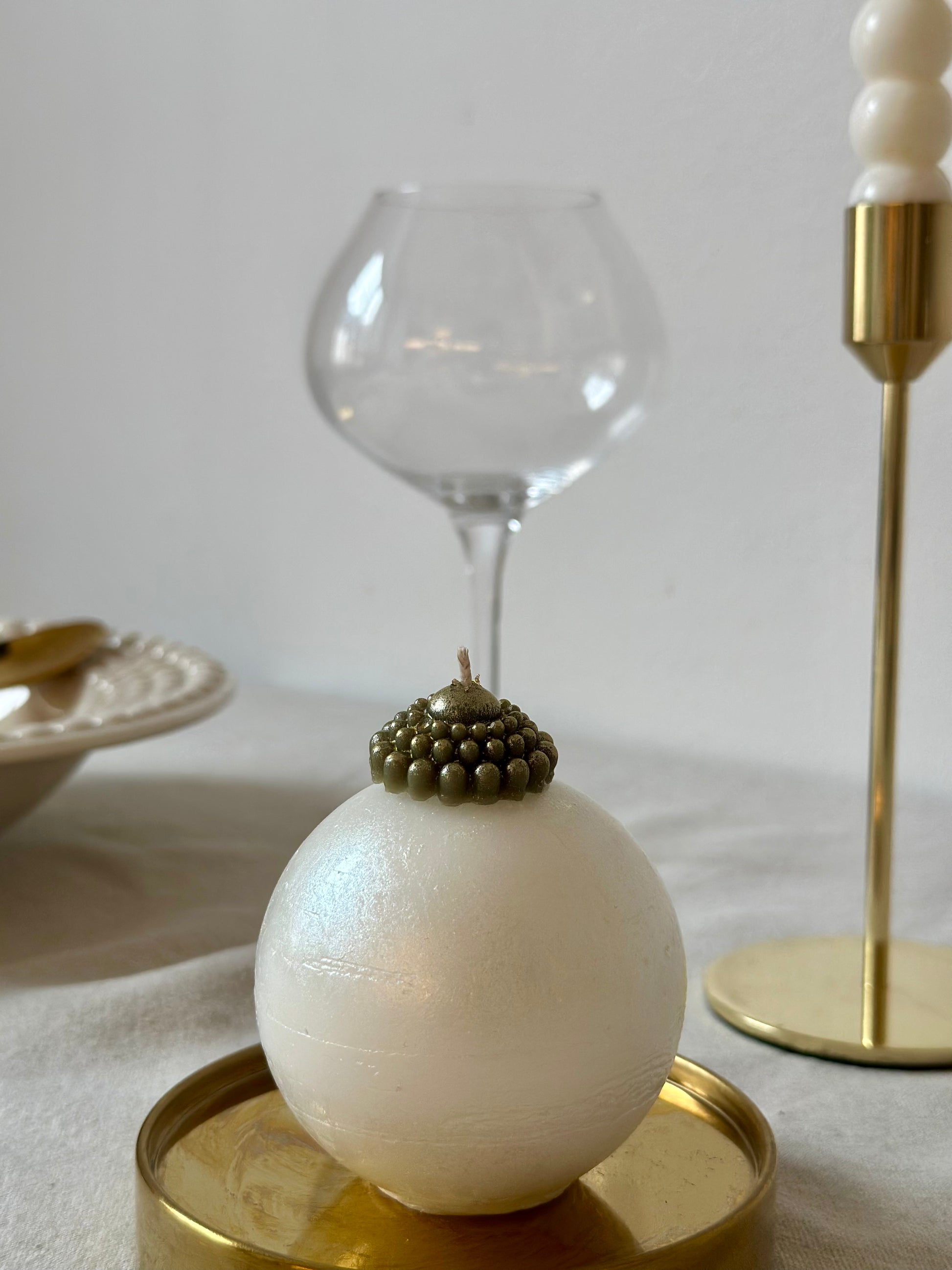 En stor julkula i härlig pärlemor handgjord i stearin med guld topp i bivax. Perfekt som unik dekoration till julen eller juldukningens mittpunkt. Eller varför inte som en present till hen som har allt? Ca 9cm hög. Säljes styckevis.