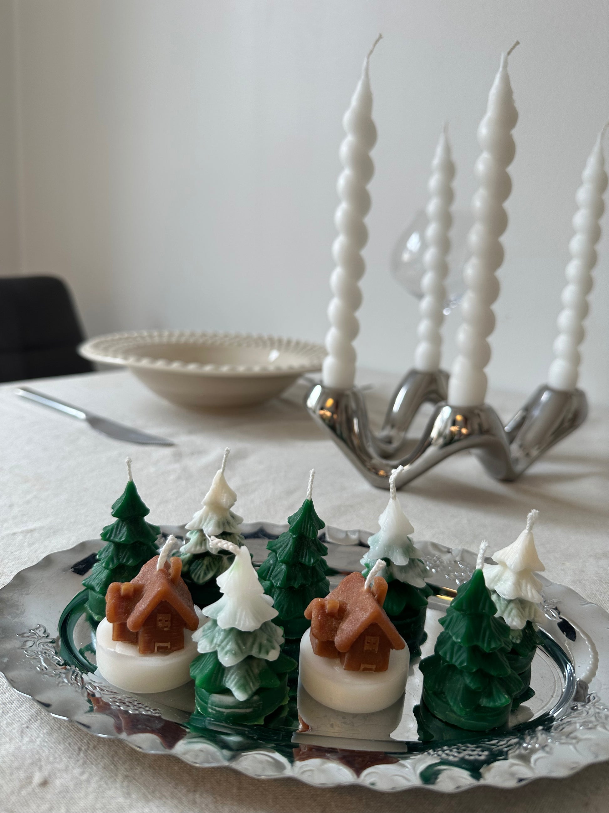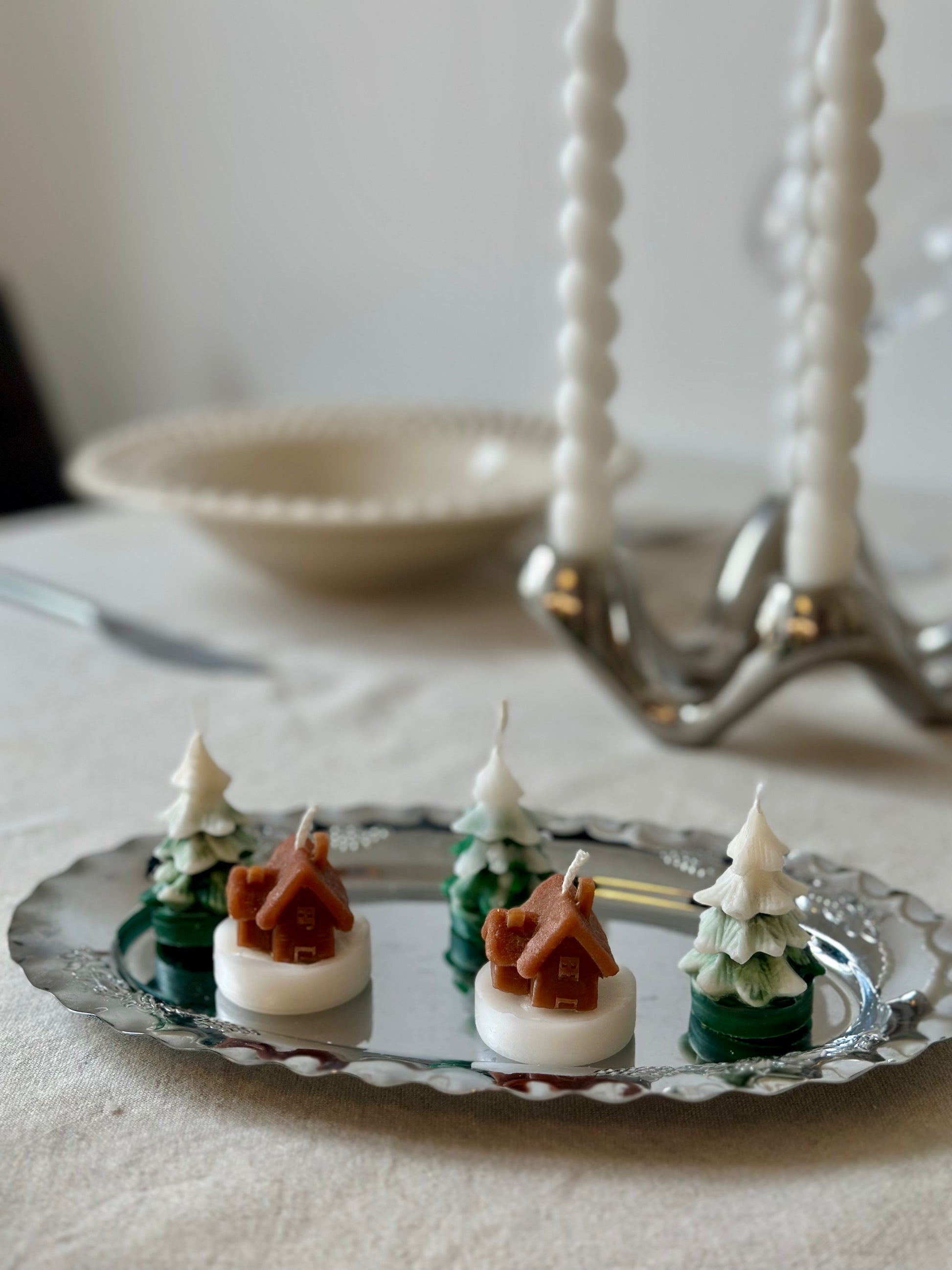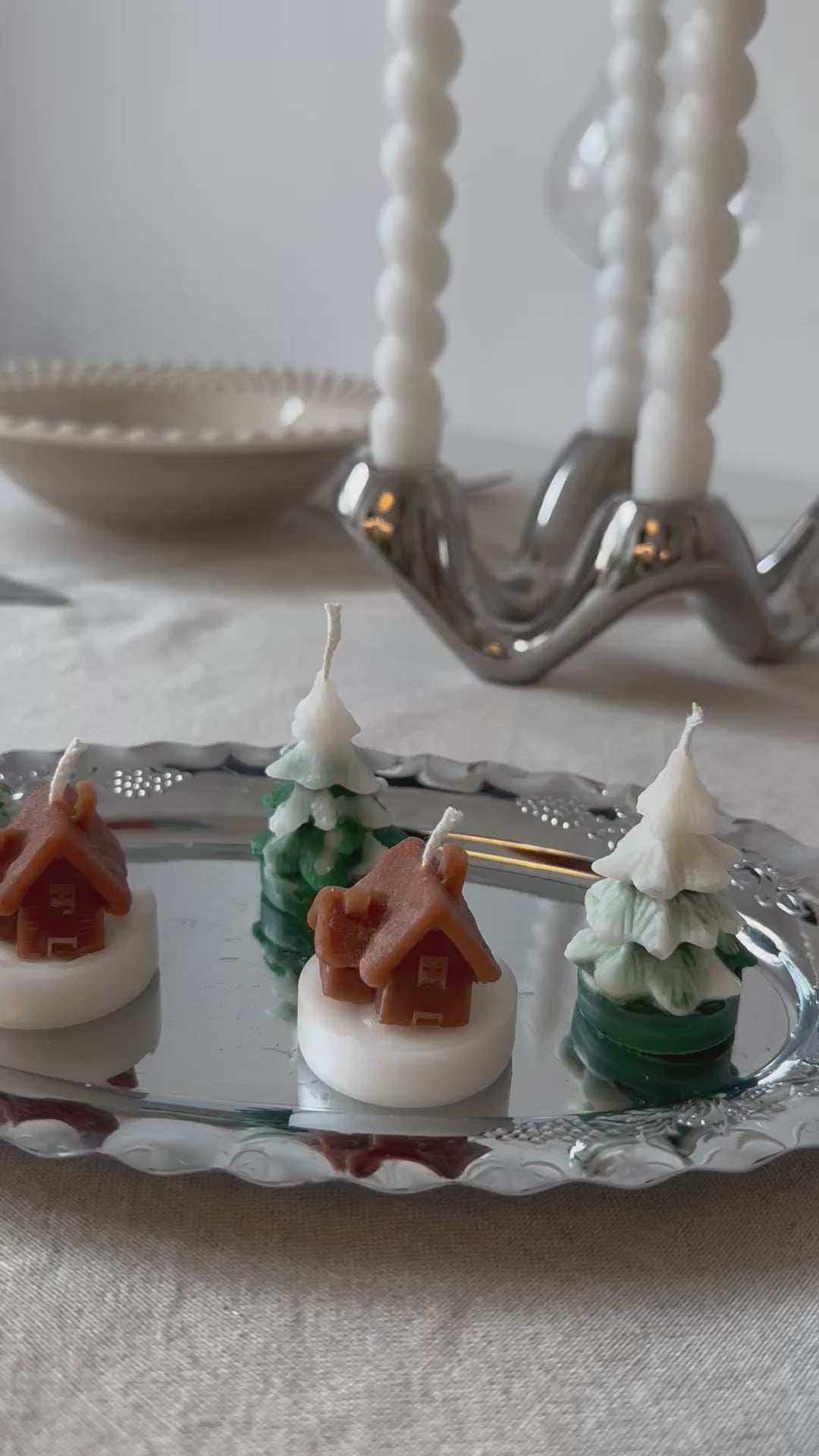Små ljus i form av pepparkakshus och granar handgjorda i 100% stearin. Säljes i set om 2st hus och 2st granar. Perfekta att julpynta med eller ge bort. Granen är ca 5,5cm hög och huset 4cm.