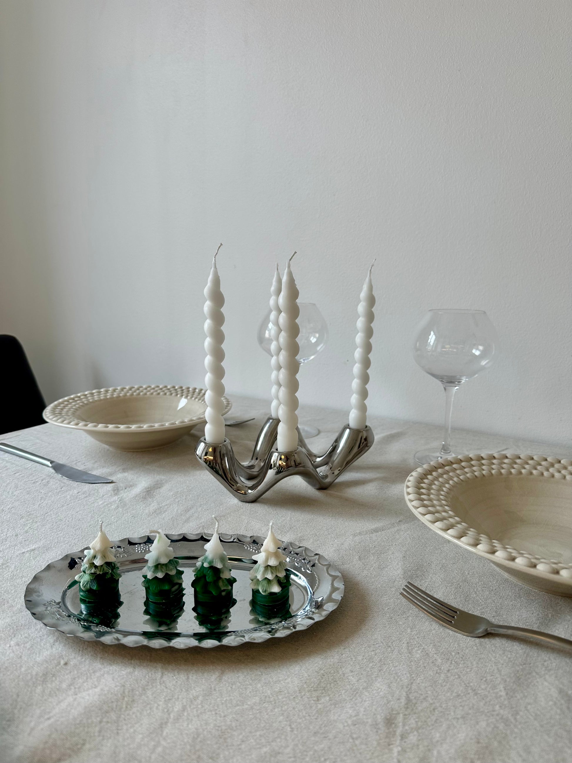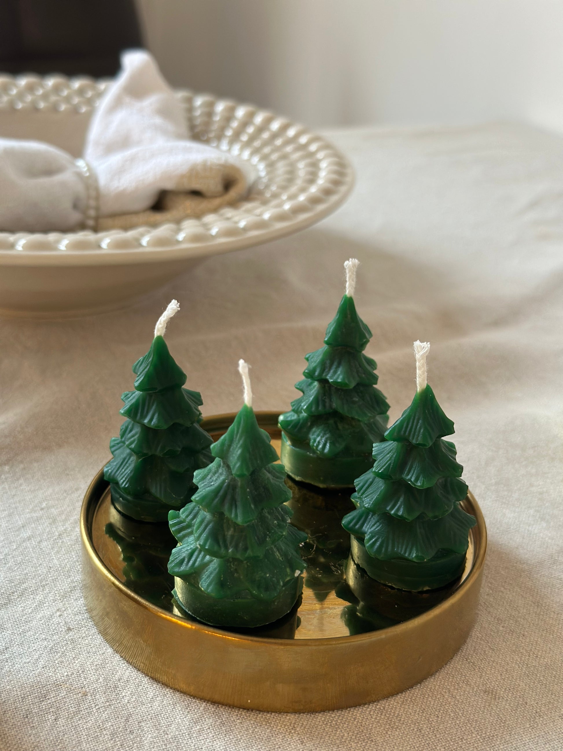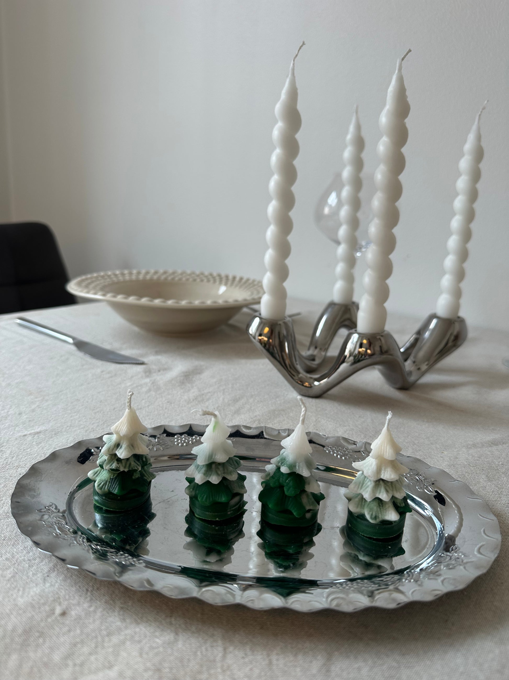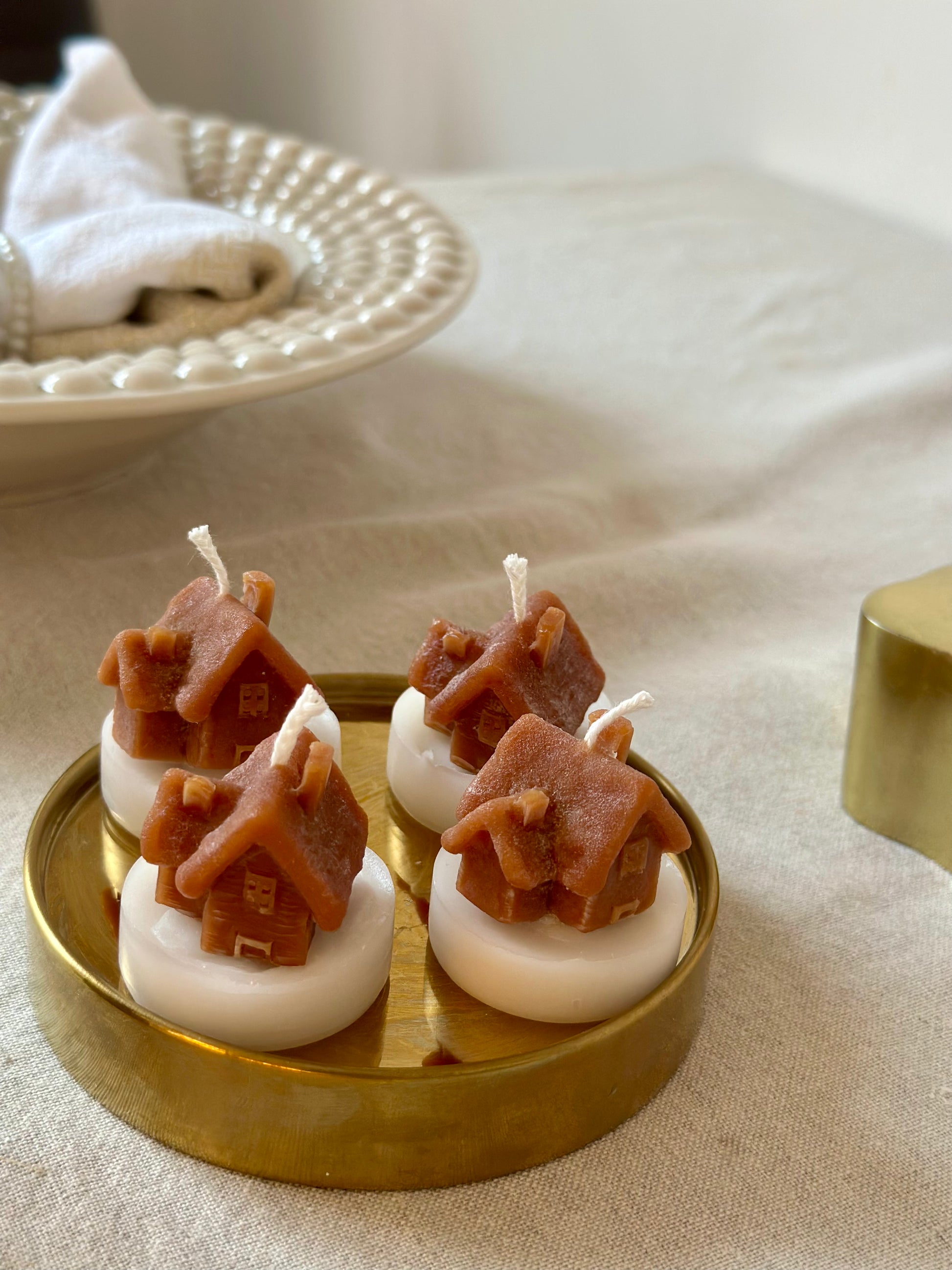 Små ljus i form av pepparkakshus och granar handgjorda i 100% stearin. Säljes i set om 2st hus och 2st granar. Perfekta att julpynta med eller ge bort. Granen är ca 5,5cm hög och huset 4cm.